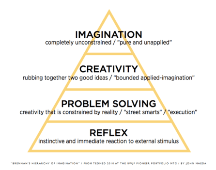 Freedom to imagine is at the top of the Maslow’s inspired ‘Brennan’s Hierarchy of Imagination’ created by legendary designer and MIT Media Lab Professor, John Maeda, following a conversation with public health innovator Patti Brennan.